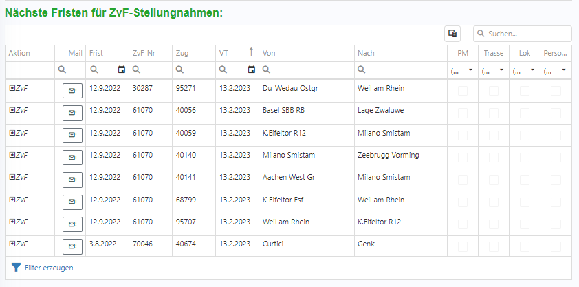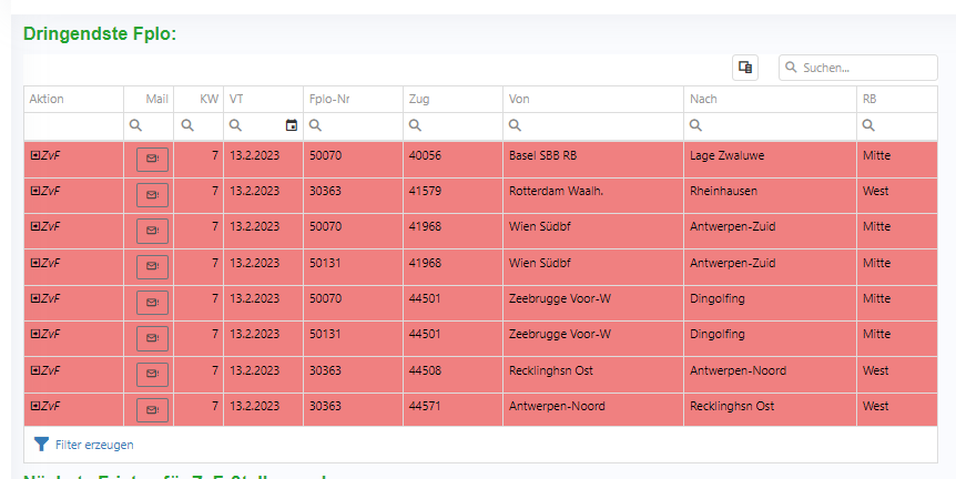 Eine Liste aller FPLOs und ZvF (fehlende Fplo), die in den nächsten Tagen umfahren werden müssen. Hier sind die unterschiedlichen Einfärbungen der ZvF-Meldungen zu beachten. Rot hinterlegte ZvF Meldungen bedeuten, dass bisher keine Fahrplananordnung dazu empfangen wurde. Ein eingefärbter Fplo wiederum zeigt an, dass hier eine kritische Verspätung (basierend auf den verknüpften Zugdaten) gemeldet wurde.