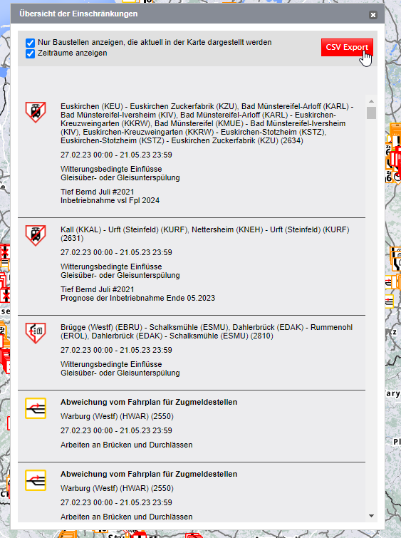 Über das Feld „CSV Export“ können Sie die ausgewählten Baustellenmeldungen dann als CSV-Datei exportieren und auf Ihrem Endgerät speichern.