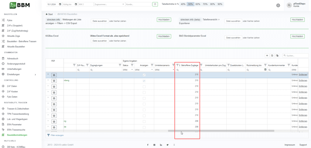 In der Spalte „Betroffene Zugtage“ überprüft der BBM, welche Ihrer Trassen- & Zeitscheiben in den entsprechenden Gültigkeitszeiträumen von diesen Baustellenmeldungen betroffen sind. Die Anzahl der Betroffenheiten wird Ihnen in dieser Spalte aufgeführt.