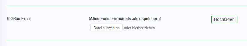 Sofern Sie die KiGBau Meldungen als Datei vorliegen haben, können Sie diese ebenfalls in den BBM importieren. Achtung: evtl. müssen Sie die Datei zunächst in ein .xlsx Format umwandeln (in der Datei „Speichern unter“ wählen und das Format „xlsx“ auswählen), damit der BBM dieses Auslesen kann.