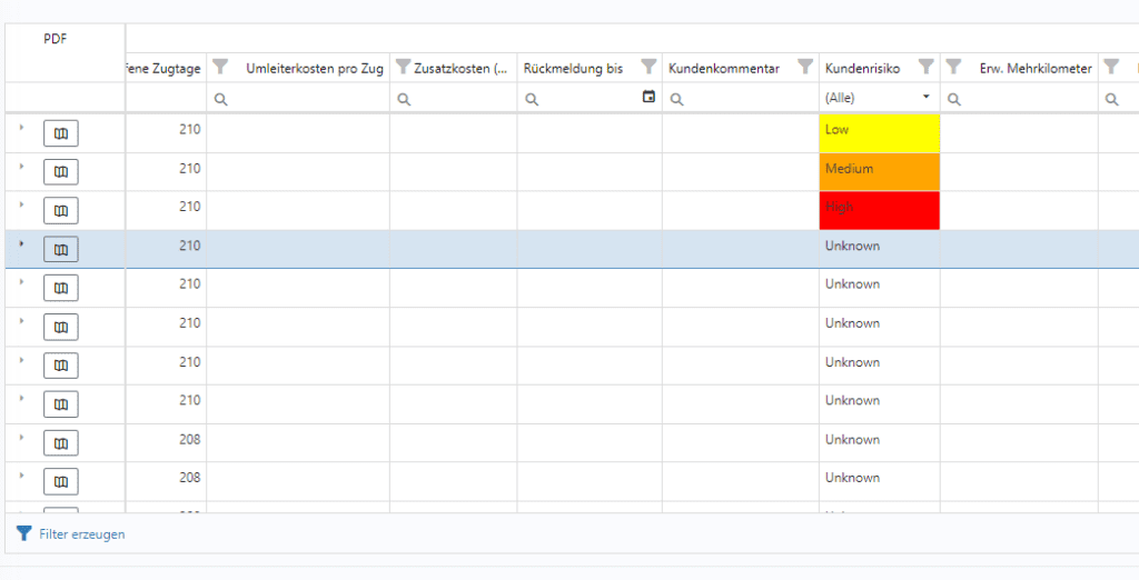 Mit Hilfe der Spalte „Kundenrisiko“ können Sie die Auswirkungen der Baustellenmeldungen kategorisieren. Dabei haben Sie die Auswahl zwischen Low, Medium, High, Not relevant und Unknown. Diese Einschätzung können Sie einerseits für sich selbst nutzen oder für Ihre Kunden vornehmen, sofern diesen einen externen Kundenzugang haben. Die Kategorisierungen werden dann im Bereich Baustellen – Betroffene Trassen angezeigt.