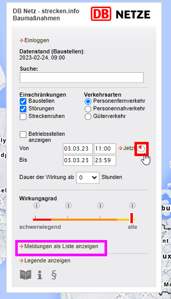 Im strecken.info Menü können Sie die Baustellenmeldungen entsprechend Ihrer Bedarfe individuell anzeigen und filtern lassen.