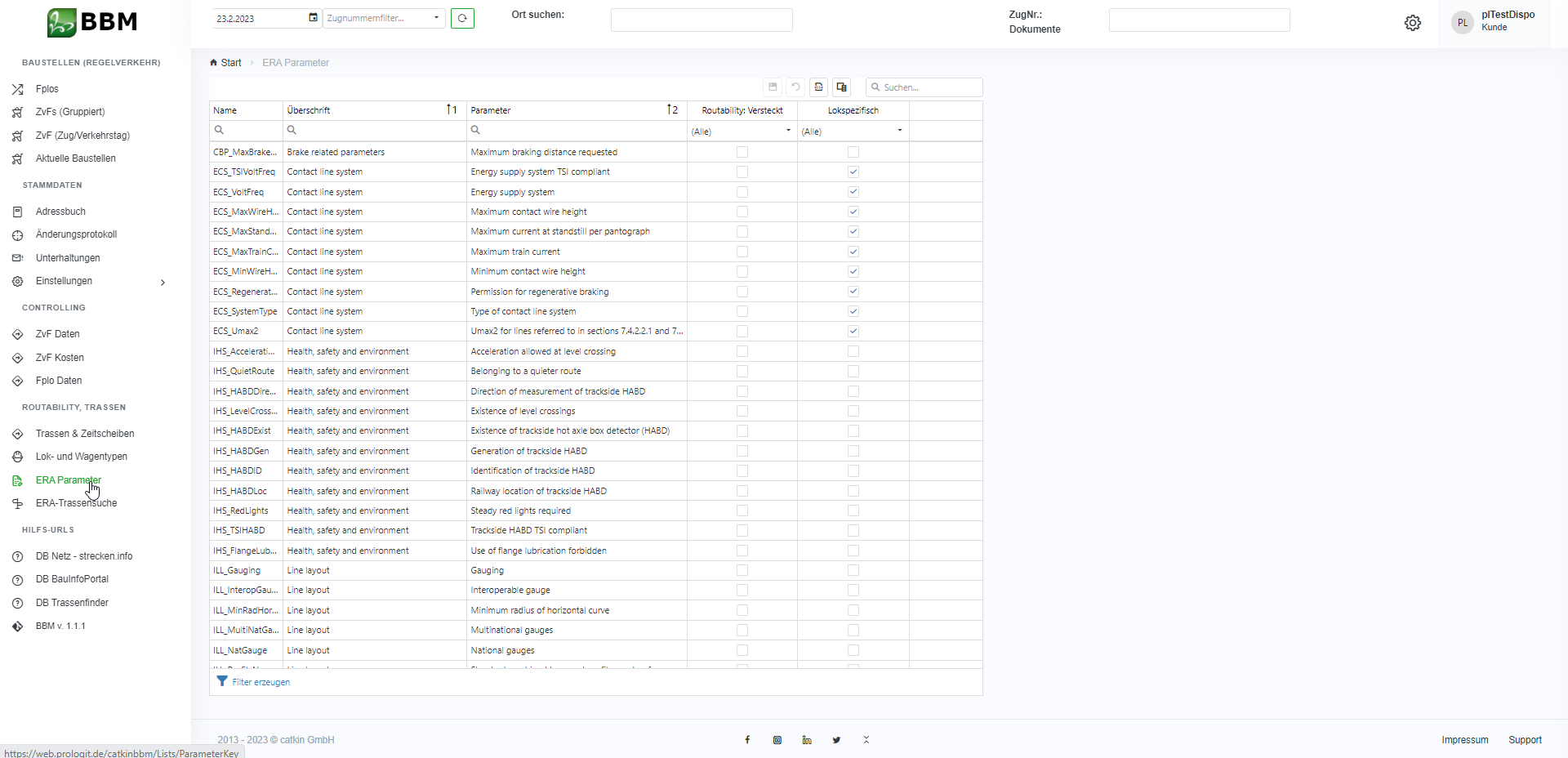 Außerdem können Sie über die Kontrollkästchen angeben, ob ein Parameter bei der Routability nicht berücksichtig werden soll (Häkchen bei „Routability: Versteckt“) oder ob ein Parameter nur für eine Lokomotive relevant ist (Häkchen bei „Lokspezifisch“). In der Spalte „Routability versteckt“ haben wir auf Basis der Vorgaben aus der „Regulation (EU) 2019/773“ bereits die Parameter herausgefiltert, die für eine Routabilityprüfung nicht zwingend erforderlich sind.