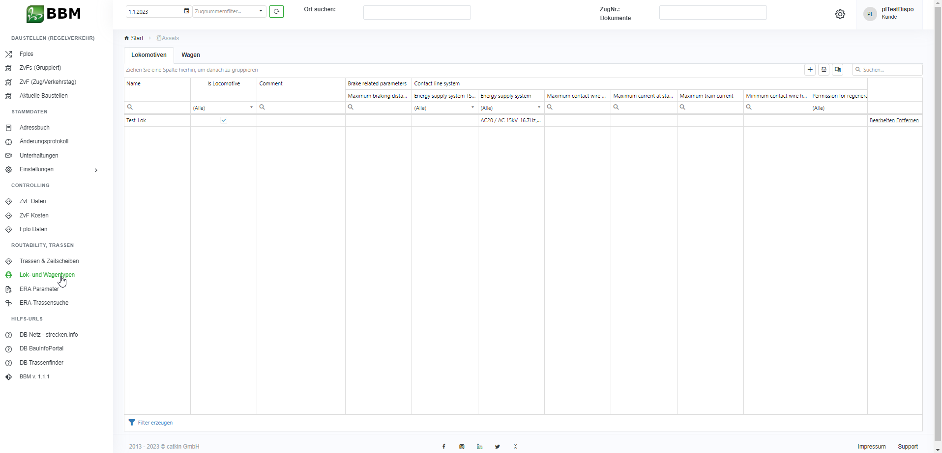 Dort können Sie die für Ihre Planung relevanten Daten, wie z.B. Kurvenradius hinterlegen. Diese Angaben werden dann bei der Überprüfung der Trassen berücksichtigt (vgl. Kapitel Trassen & Zeitscheiben und ERA-Trassensuche).