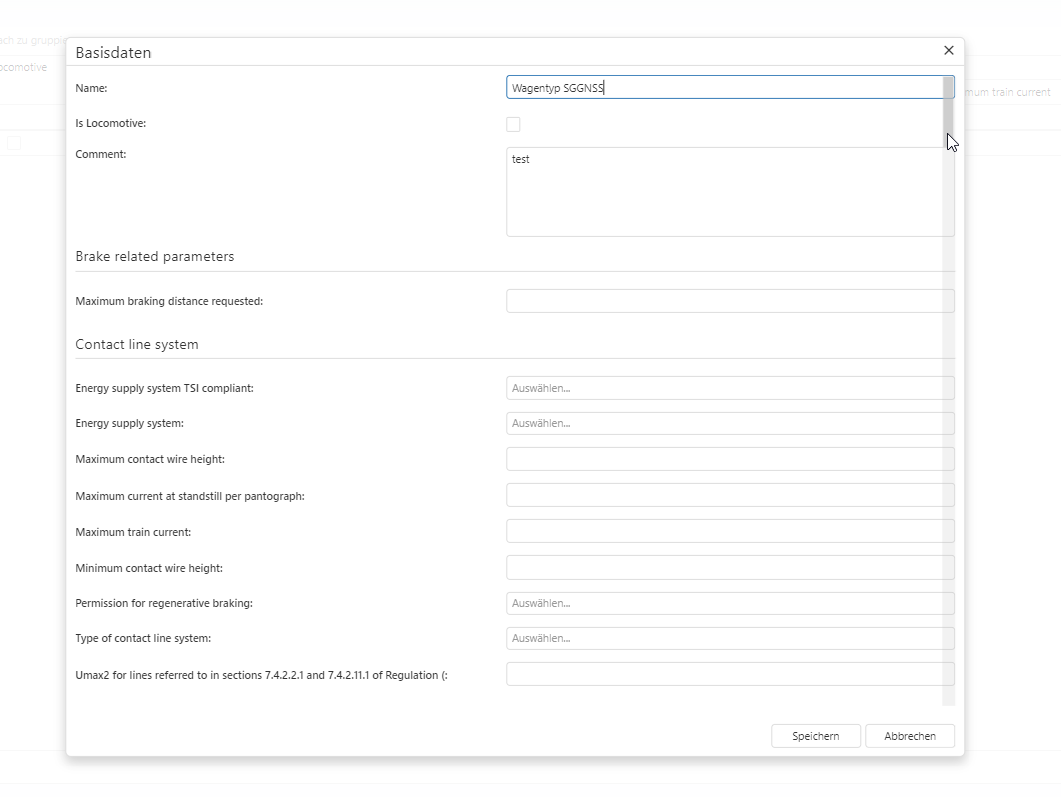 Über das Feld „Bearbeiten“ können Sie die einzelnen Angaben hinterlegen. Dafür öffnet sich ein Pop-up Fenster, in dem Sie die einzelnen Angaben machen und Ihre Wagentypen und Lokomotiven benennen können.
