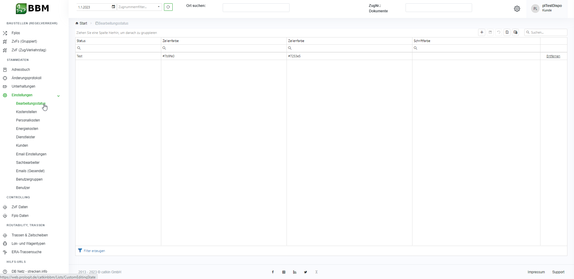 Über den Menüpunkt „Einstellungen“ –> „Bearbeitungsstatus“ können einzelne Mitarbeiter/Mitarbeiterinnen unterschiedliche Bearbeitungsstatus definieren, was als Koordinationsfunktion dient. Damit können Sie untereinander einen Status vergeben, sodass optisch schnell eingesehen werden kann, welche Meldungen sich in welchem Bearbeitungsstatus befinden. Der jeweilige Status kann dabei namentlich (vgl. Abbildung 4.1-5) und als Zelle, Zeile oder Schrift (vgl. Abbildung 4.1-6) farblich beliebig definiert werden.