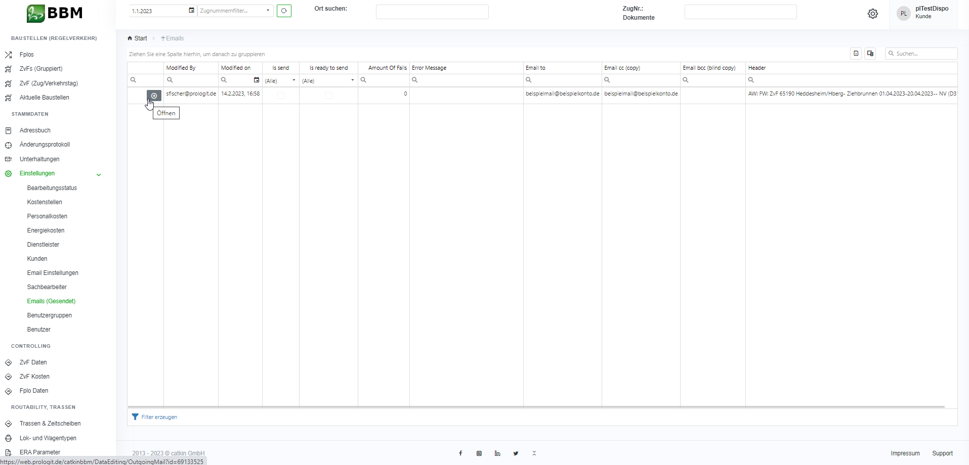 Über den Menüpunkt „Einstellungen“ –> „Emails (Gesendet)“, lassen sich in einer Liste alle E-Mails einsehen, die über den BBM versendet wurden. Hierüber kann eine E-Mail auch nochmal versendet werden.