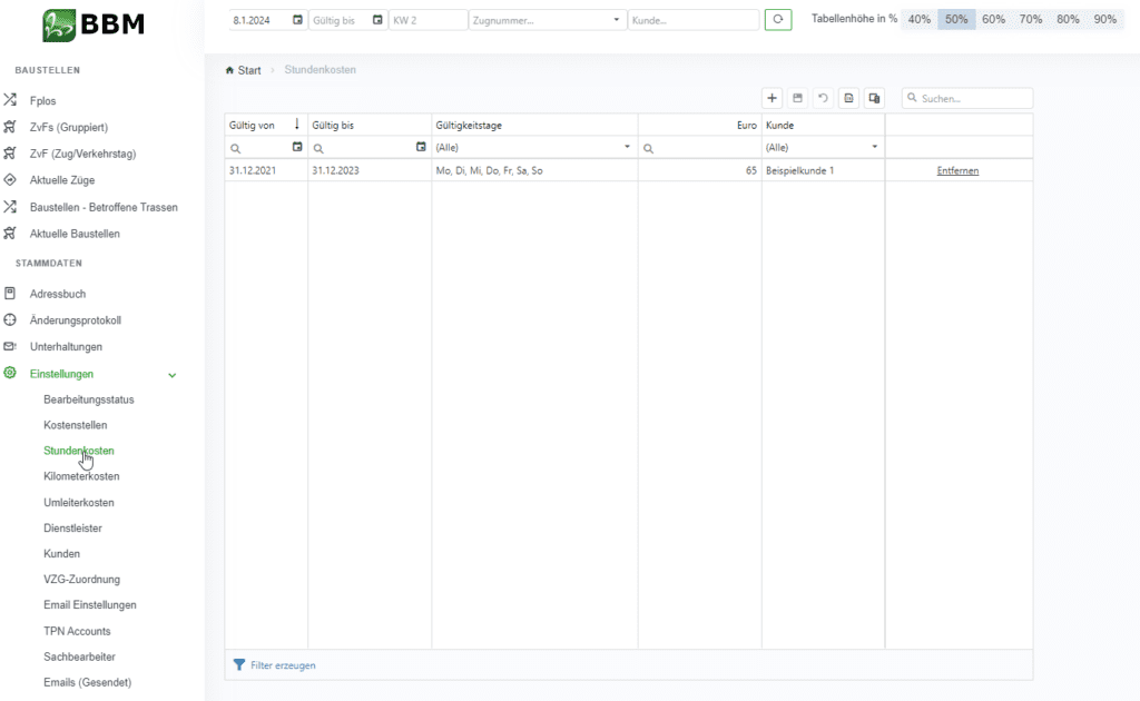 Für die Berechnung von Zusatzkosten durch Baumaßnahmen, können Stundenkosten als Stammdaten hinterlegt werden. Diese werden im Menü über „Einstellungen“ –> „Stundenkosten“ erreicht. Diese können sich z.B. auf Personalkosten beziehen und Kundenindividuell verknüpft werden. Somit haben Sie Ihren Kunden gegenüber stets eine Aussage, welche Zusatzkosten Ihnen entstanden sind.